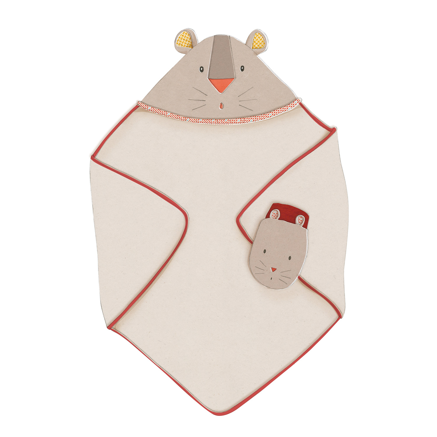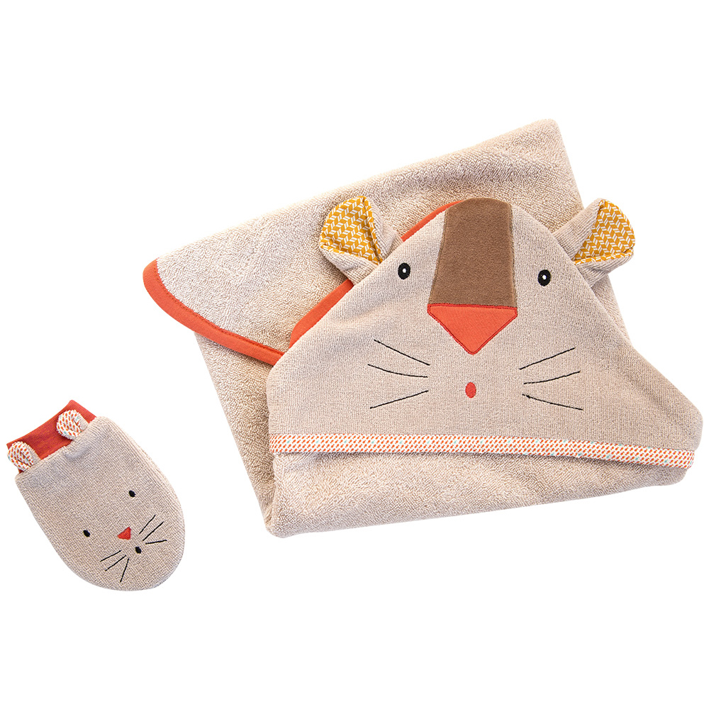 Accappatoio spugna Les Papoum Moulin Roty, di colore grigio in morbida spugna per finire in dolcezza il bagnetto dei piccoli. L’accappatoio è dotato di un simpatico cappuccio con il musetto di un topolino ricamato sopra, e ha anche delle divertenti orecchie di stoffa. L’accappatoio è corredato di un tenero guantino anche questo a forma di topolino, per rendere il bagnetto un gioco da fare con i grandi.