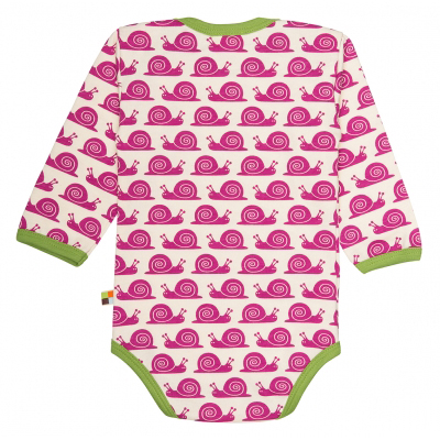 Body chiocciole viola maniche lunghe Loud+Proud, con bordo verde muschio a maniche lunghe 100% cotone organico certificato GOTS (Global Organic Textile Standard), stampati con tinture a basso impatto ecologico. Le fantasie Loud+Proud sono tutte allegre e divertenti per un estate da bambini. Lo scollo americano rende il body molto pratico ad infilare.