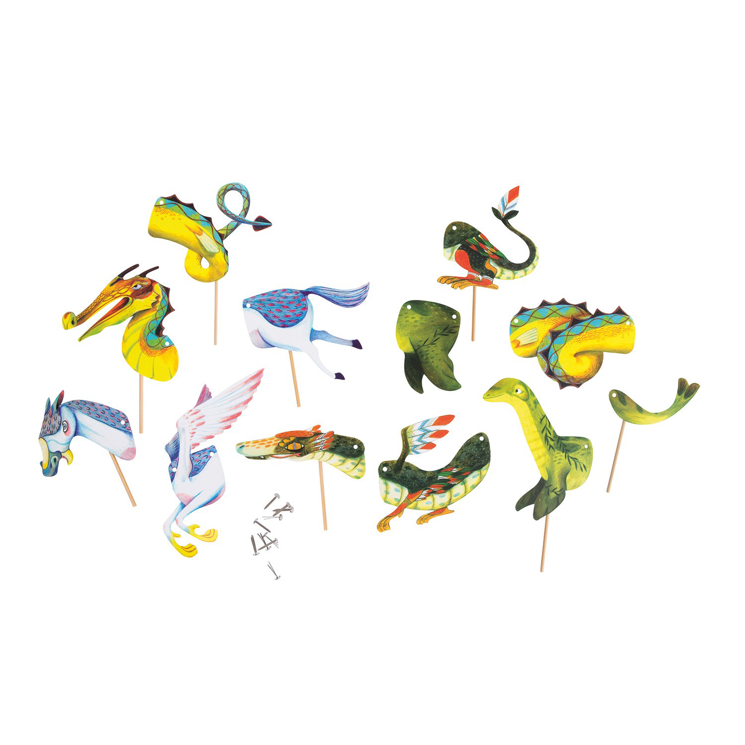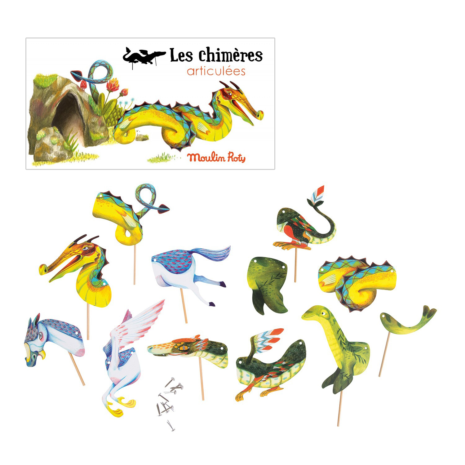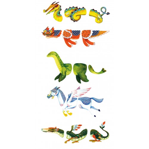 Gioco figure animali snodati Moulin Roty. 15 pezzi di cartone per ricostituire gli animali chimerici, mostri mitologici o crearne di nuovi. Le parti sono collegate con chiodini e articolati su bacchette. Una volta proiettati sulla parete, gli animali prendono vita e la magia delle ombre comincia. Muovendole davanti una lampada, proietterete al muro un universo magnifico, per far sognare ai vostri bimbi un mondo incantato… e presto saranno stimolati a inventarne loro stessi nuove storie! Nella confezione troverete i pezzi per realizzare 5 sagome: il drago cinese, il serpente piumato, il drago di mare, Nessie e Pegaso. Questo gioco stimola la fantasia e la creatività.